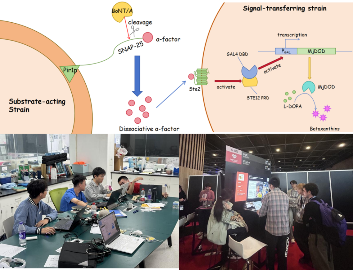 我校参赛项目为“基于酵母的肉毒杆菌毒素选择性蛋白水解生物测定法”(Selective Proteolytic Botulinum Toxin Bioassay Based On Yeast)。该项目聚焦肉毒杆菌毒素A型(BoNT/A)在食品安全与医疗安全领域引发的实际问题,致力于开发快速、精准且低成本的检测方案。团队利用合成生物学技术,设计出一套名为“SPY”的毒素生物检测系统,其创新思路与实用价值获得了评委的高度认可。