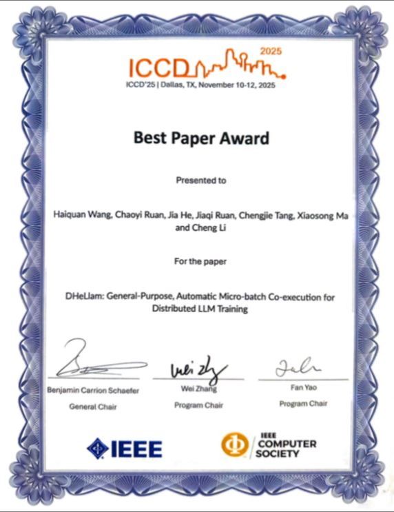 近日,在美国达拉斯举行的第43届IEEE国际计算机设计会议(IEEE International Conference on Computer Design, ICCD 2025)上,我校计算机科学与技术学院与新加坡国立大学、阿联酋穆罕默德·本·扎耶德人工智能大学(MBZUAI)、山西大学以及合肥综合性国家科学中心人工智能研究院合作发表的论文《DHeLlam: General-Purpose, Automatic Micro-batch Co-execution for Distributed LLM Training》荣获大会“唯一最佳论文奖”(Best Paper Award)。