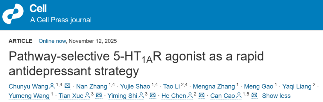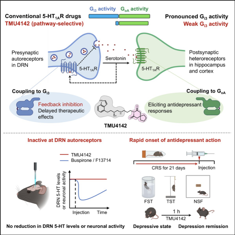 2025年11月12日,中国科学技术大学生命科学与医学部、免疫应答与免疫治疗全国重点实验室、合肥综合性国家科学中心大健康研究院曹灿教授课题组与中国科学技术大学生命科学与医学部薛天教授课题组以及天津医科大学陈贺特聘研究员课题组联合研究团队,在Cell杂志发表题为“Pathway-Selective 5-HT1AR Agonist as a Rapid Antidepressant Strategy”的研究文章。该研究提出了一种基于5‑HT1A受体信号通路选择性的快速抗抑郁新策略,并据此理性设计出候选化合物TMU4142。实验结果显示,TMU4142在抑郁小鼠模型中展现出显著的快速抗抑郁样效果。该策略直击临床上选择性血清素再摄取抑制剂(SSRIs)类抗抑郁药物普遍存在的起效缓慢难题,为新一代快速抗抑郁药物的研发提供了崭新的思路和可行路径。