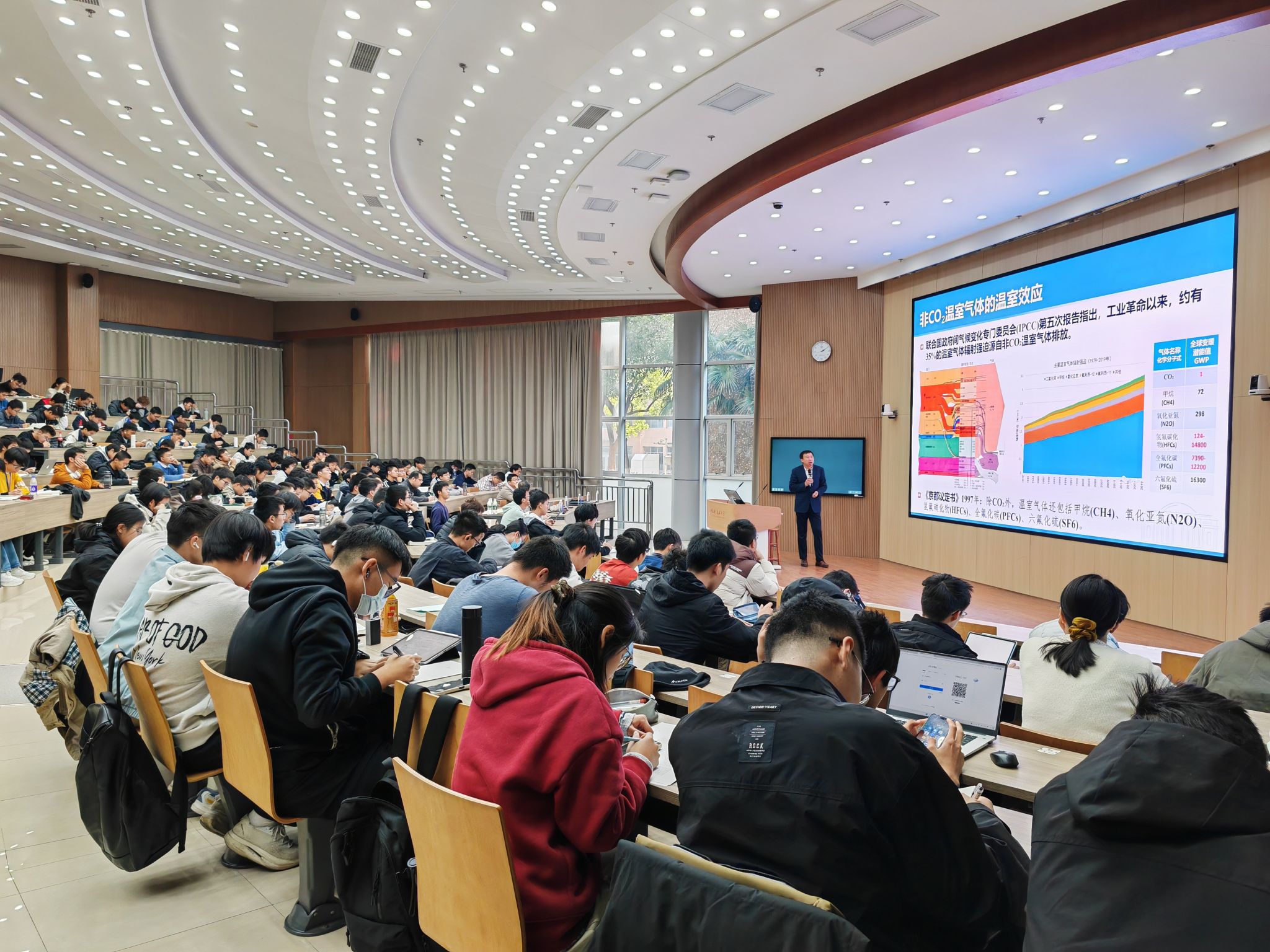 11月26日下午,“工程科学前沿” 课程系列讲座之 “双碳战略与CO₂热力循环技术” 报告会在西区3B103多功能教室举办,中国科学院院士、校党委书记舒歌群教授为300余名2025级本科生授课。报告会由工程科学学院执行院长吴恒安主持。