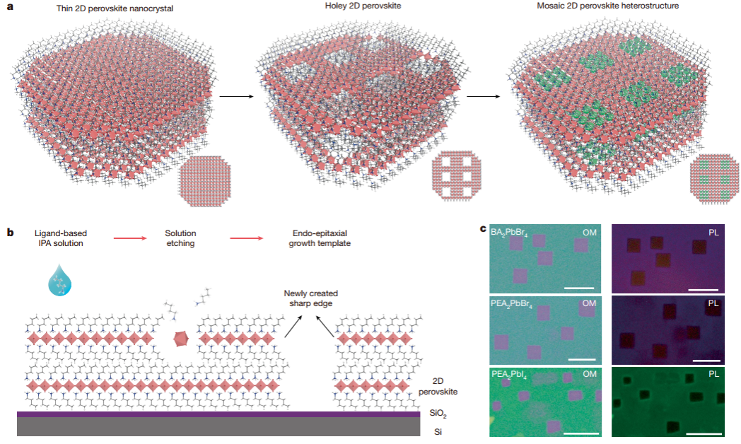 中国科学技术大学化学与材料科学学院张树辰特任教授团队,联合美国普渡大学、上海科技大学研究人员,在二维钙钛矿异质结结构构筑方面取得重要突破。研究团队首次在薄层二维钙钛矿单晶中实现了面内马赛克式横向异质结的可控图案化构筑,相关研究成果以“Mosaic lateral heterostructures in two-dimensional perovskite”为题,于北京时间1月15日在线发表在《自然》(Nature)杂志。