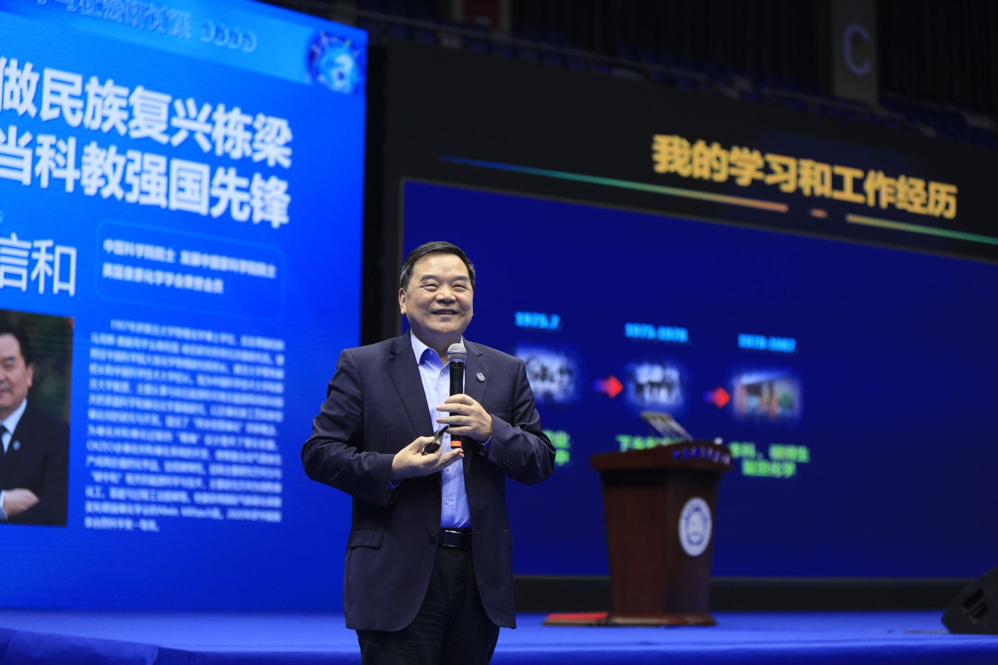 本次报告以“争做民族复兴栋梁 勇当科教强国先锋”为主题,包信和以其深厚的学识与家国情怀,从“学习工作经历与时代机遇”“国家需求与时代召唤”“‘两弹一星’精神与家国情怀”“争做复兴栋梁、勇当强国先锋”四个方面,与同学们展开了深入交流。