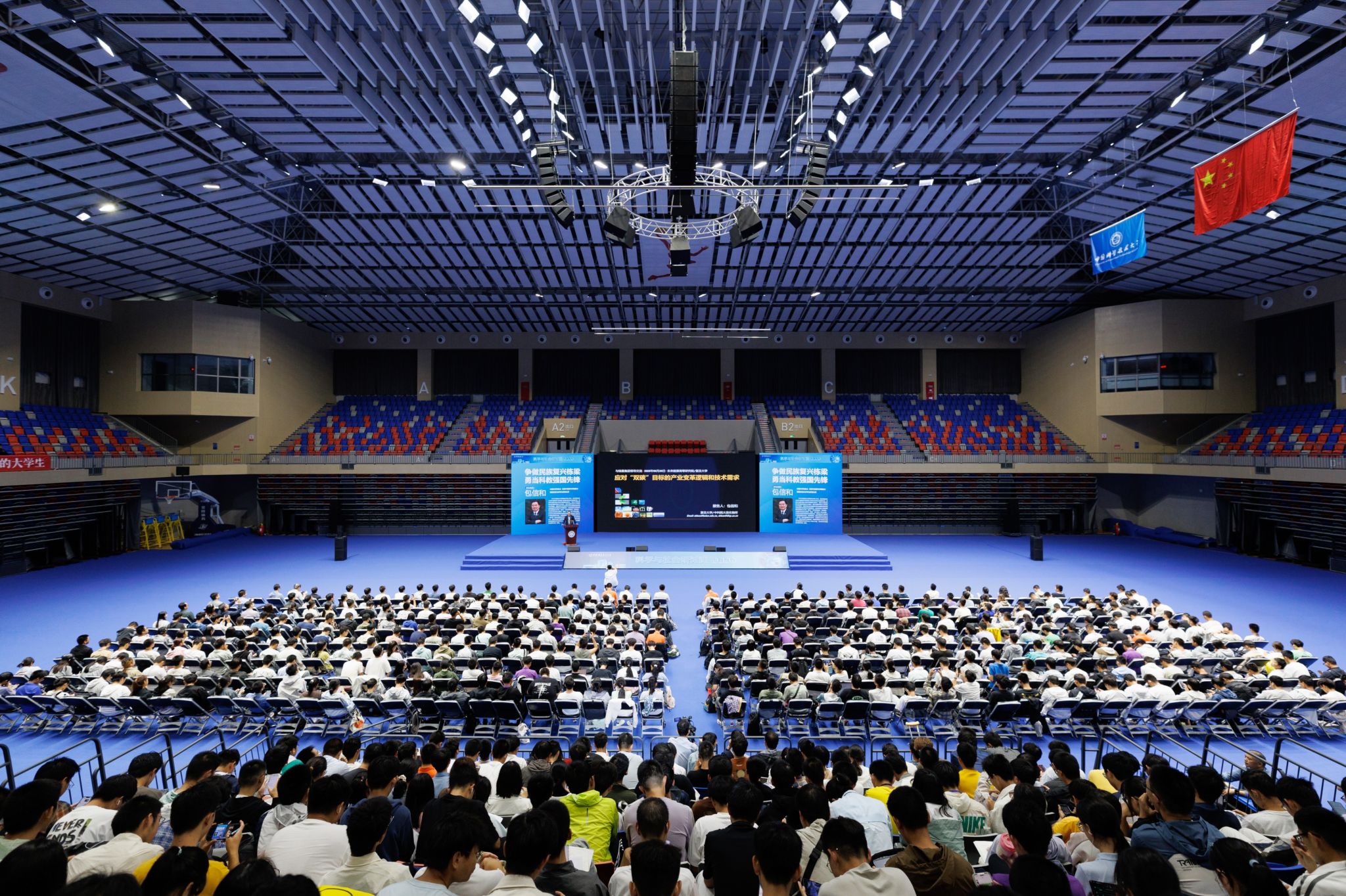 9月24日晚,中国科学技术大学“科学与社会”研讨课主题报告在中区综合体育馆举行。中国科学院院士、中国科学技术大学原校长包信和应邀作主题报告。校党委书记舒歌群、校长常进出席报告会,全体2025级本科生、研究生新生代表及新生辅导员现场参加,其他研究生线上听课。报告会由校党委常委、副校长汪毓明主持。