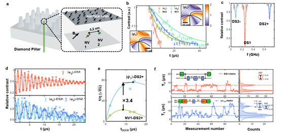 图2:基于纠缠态增强的暗自旋探测实验。a.中心位置制备有氮-空位色心对的金刚石纳米柱结构示意图。b.不同传感器初态的相干时间对比。c.通过使用纠缠态传感器分辨出周围两个暗自旋DS1和DS2的特征谱。d.纠缠态传感器探测不同暗自旋时的相干相位演化。e.纠缠态传感器对DS2进行探测时的灵敏度增益。f.通过NV与暗自旋DS1构建纠缠传感器,对不稳定自旋信号进行持续监测。