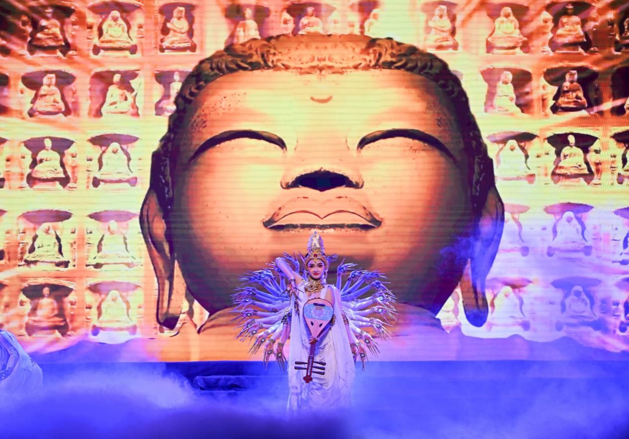 随着大幕拉开,沉睡千年的敦煌壁画仿佛在现代科技的加持下“活”了过来。当聚光灯汇聚舞台中央,经典的“反弹琵琶”一幕将现场气氛推向高潮。演员们眼神灵动,指尖如莲花绽放,罗裙随风而舞,既有“腾踏似春雷”的刚健,又有“飘然若游龙”的柔美,完美复刻了莫高窟112窟《伎乐图》中经典的“反弹琵琶”舞姿。