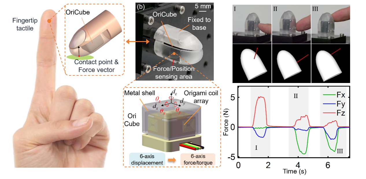 中国科学技术大学工程科学学院、人形机器人研究院王洪波研究员课题组研制了一种名为“OriCube”的指尖大小六维力/力矩(F/T)传感器。该传感器体积仅14×14×12mm³、重量4g,在23N量程下实现3mN级分辨率,并可嵌入机器人灵巧手指尖,在曲面接触中实时输出接触点位置与力矢量,为机器人“像人一样用手指触摸与操作”提供关键感知能力。成果以“A Fingertip-Size Six-Axis Force Sensor via Origami Coil Arrays for Intrinsic Tactile Sensing”为题发表在国际期刊《IEEE/ASME 机电一体化汇刊》(IEEE/ASME Transactions on Mechatronics)上。