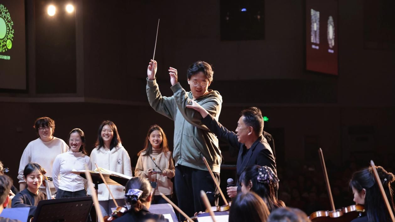 活动特别设置多个互动环节,让师生从“聆听者”变为“参与者”。在问答环节,同学们就小提琴的演奏特点、交响乐的欣赏方法等问题与胡咏言深入交流,现场气氛热烈;听音识器互动中,同学们背对舞台仅凭听觉辨别乐器音色,在趣味中加深了对交响乐器的认知;在指挥体验环节,11位学生在胡咏言的指导下轮流挥动指挥棒,亲身感受乐团“指挥”这一角色的魅力。